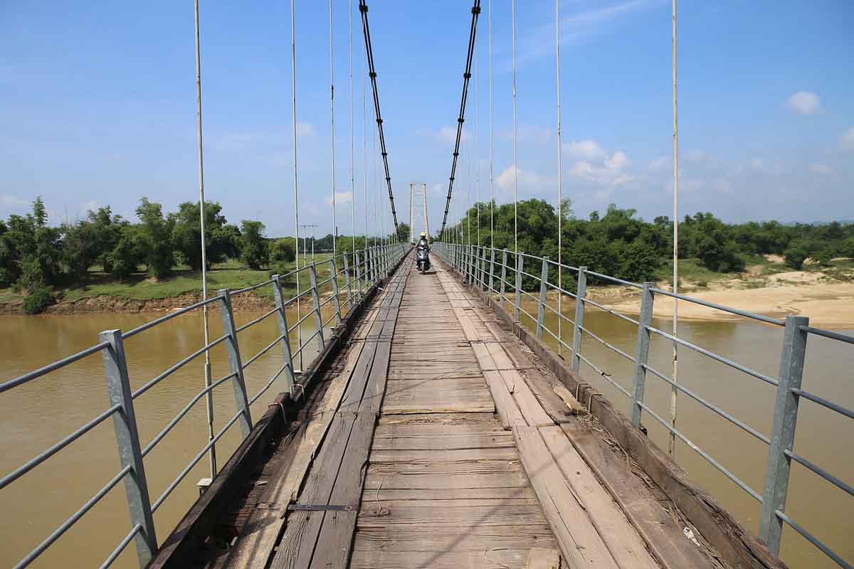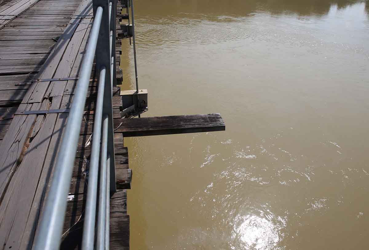 Ván cầu sắp tuột xuống lòng sông. Chiều cao từ mặt cầu xuống mặt nước hơn 10 m.