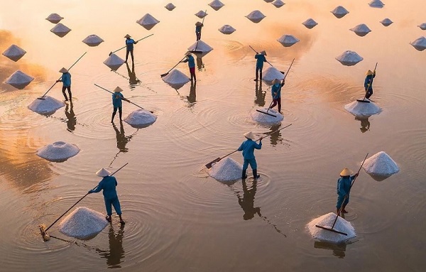 Nghề làm muối đòi hỏi các diêm dân sự cần cù, chịu khó cùng những tri thức, kinh nghiệm sản xuất gắn với thiên nhiên. Trong tiếng sóng rầm rì của biển cả, bạn sẽ được nhìn thấy vẻ đẹp của cánh đồng muối sống động với sự chăm chỉ, cần cù của những người diêm dân.