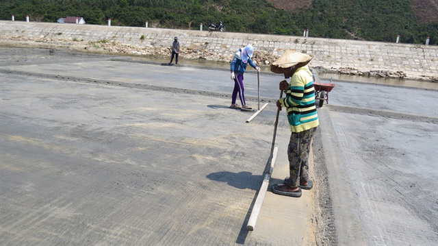 Bước đầu, trên mỗi ruộng muối, người làm muối sẽ xử lý nền đất cho thật chặt, hạn chế tối đa nước biển thấm vào đất. Sau đó, tiếp tục cho nước biển vào phơi khô để thêm độ rắn cho đất. Khi nền ruộng muối đã đạt yêu cầu, người dân mới bơm nước biển vào bên trong.