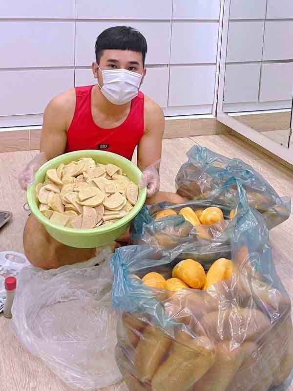 Diễn viên Tiko Tiến Công tận dụng không gian nhỏ trong nhà, tự tay làm hàng trăm phần bánh mì để tặng người dân.