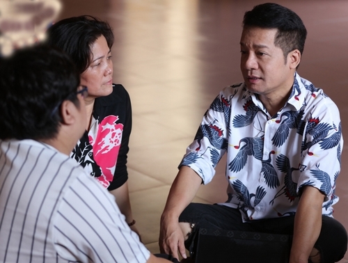 Nghệ sĩ Minh Nhí trò chuyện cùng người nhà Anh Vũ tại chùa.