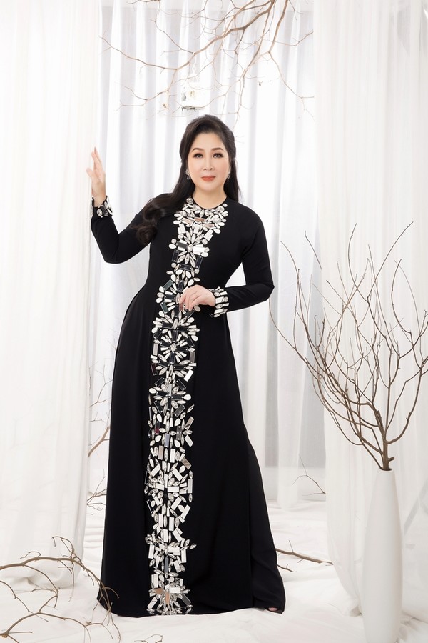 Trong bộ ảnh mới, nếu như các thiết kế áo dài màu xanh lá, xanh dương, đỏ… mang đến sự nổi bật cho bà bầu sân khấu kịch thì những bộ trang phục màu đen lại toát lên vẻ quyền lực của một bà xui, đúng với tinh thần mà nhà thiết kế muốn truyền tải. Vẫn là phom dáng truyền thống với chi tiết cổ tròn, cổ vuông… nhà thiết kế Minh Châu đã thổi thêm hơi thở hiện đại cho bộ trang phục thông qua các hoạ tiết rồng phượng, hoa văn được đính kết bằng chất liệu bắt mắt, giúp các bà sui trở nên nổi bật, ấn tượng hơn trong ngày trọng đại.
