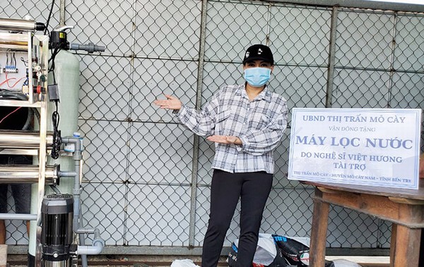 Nghệ sĩ Việt Hương cũng đã chi hơn 100 triệu đồng để lắp đặt máy lọc nước cho bà con hai huyện Mỏ Cày Nam và Mỏ Cày Bắc của tỉnh Bến Tre đang bị hạn mặn. Sau khi lắp đặt xong hệ thống, nữ nghệ sĩ cũng đến tận nơi để kiểm tra chất lượng của máy lọc nước. Chia sẻ về việc làm của mình, nữ nghệ sĩ nói: “Thời điểm này mọi chuyến đi từ thiện không cấp bách tôi đều tạm hoãn để tập trung giúp đỡ những người khó khăn vì Covid-19 và nạn hạn mặn ở Bến Tre. Tôi hạnh phúc khi lắp được hai máy lọc nước công suất 400 – 500 lít nước/giờ cho hai huyện Mỏ Cày Nam và Mỏ Cày Bắc. Đây là những vùng đang bị nhiễm mặn rất nặng“.