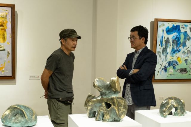 Điêu khắc gia Đào Châu Hải và họa sĩ Đinh Phong trong triển lãm “Người bay và giấc mơ siêu thực” tại Hà Nội.