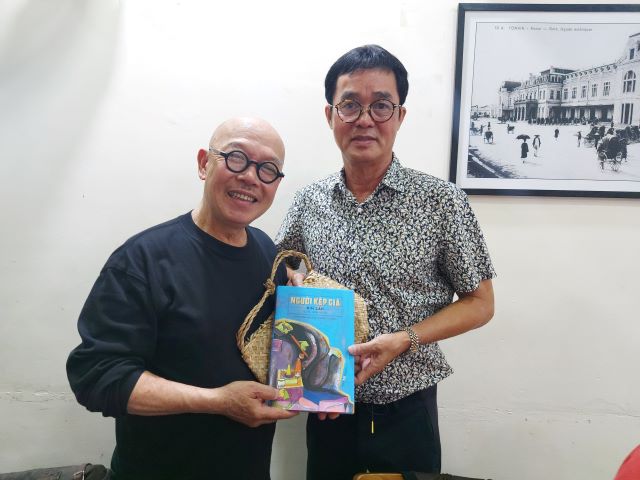 Họa sĩ Thành Chương tặng tác phẩm “Người kép già” Tuyển truyện ngắn đặc sắc của nhà văn Kim Lân cho họa sĩ Đinh Phong.