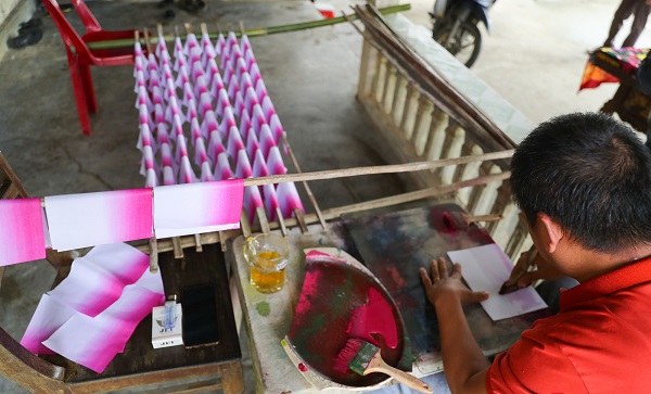 Công đoạn phết màu cho giấy và phơi khô trước khi tạo hình.