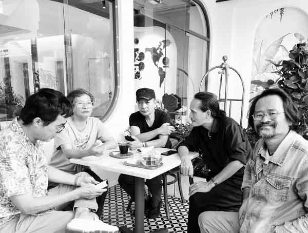 Từ trái qua: Họa sĩ Đinh Phong, họa sĩ nhà phê bình Lý Trực Sơn, điêu khắc gia Đào Châu Hải, họa sĩ Trần Hải Minh và người thực hiện bài viết. Cà phê triển lãm “Giấc mơ siêu thực” tại bảo tàng Mỹ thuật TP.HCM.