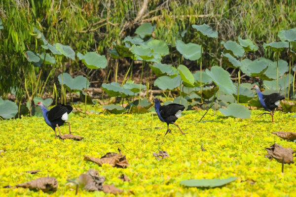 Thong dong trên nhịp cầu tre lung linh đáy nước, du khách sẽ thật ngỡ ngàng khi vương quốc muôn chim mở cửa, với hàng nghìn cánh chim, cò đang thả mình trên không trung, lượn lờ vũ khúc thanh âm lãnh lót rồi nhẹ nhàng đáp xuống đậu đặc ken trên những ngọn tràm. Tinh mơ, cả họ nhà chim cò đều thức giấc, một vài con đầu đàn cất cánh bay vút lên trời cao, ngay lập tức các con khác cũng vội vàng tung cánh theo với một đội hình đều đặn, không em nào tách bầy. Chỉ còn lại những tổ chim non đung đưa trên cành lá, chúng dạn dĩ ló đầu ra chào nhau cùng luyện thanh “chí chóe”.