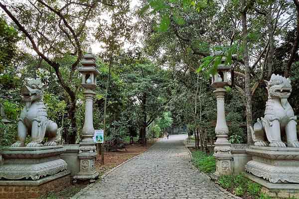 Hàng cây xanh tạo “kết giới” ngăn cách chùa và môi trường khói bụi bên ngoài.