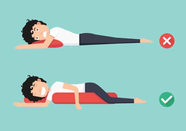 Những người bị đau lưng nên nằm ngửa và kê 1 chiếc gối ở dưới đầu và 1 chiếc gối dưới đầu gối. Việc sử dụng 2 chiếc gối như vậy sẽ giúp cột sống của bạn được nâng đỡ, định hình được đường cong sinh lý của cột sống. Điều quan trọng là bạn phải giữ cột sống cong tự nhiên.