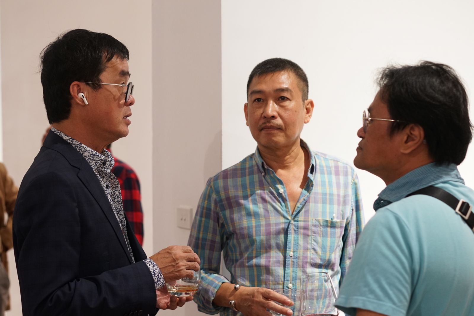 Họa sĩ Lê Thiết Cương (giữa) trong khai mạc triển lãm “Người bay và giấc mơ siêu thực” của họa sĩ Đinh Phong.