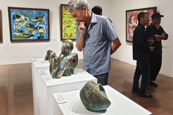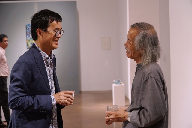 Điêu khắc gia họa sĩ Đào Châu Hải đến chúc mừng họa sĩ Đinh Phong tại tối khai mạc triển lãm.