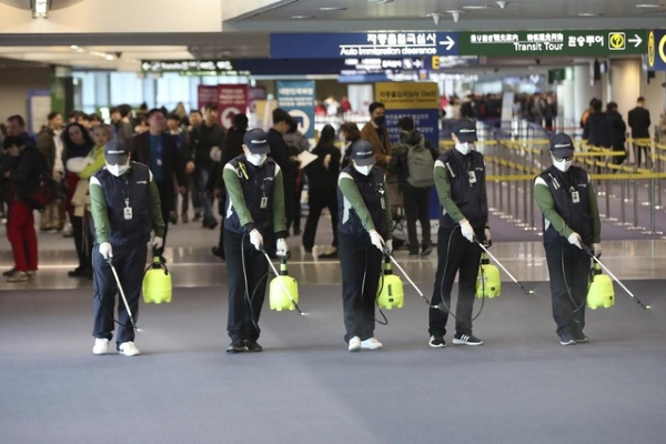 Nhân viên khử trùng sàn sân bay quốc tế Incheon, Hàn Quốc