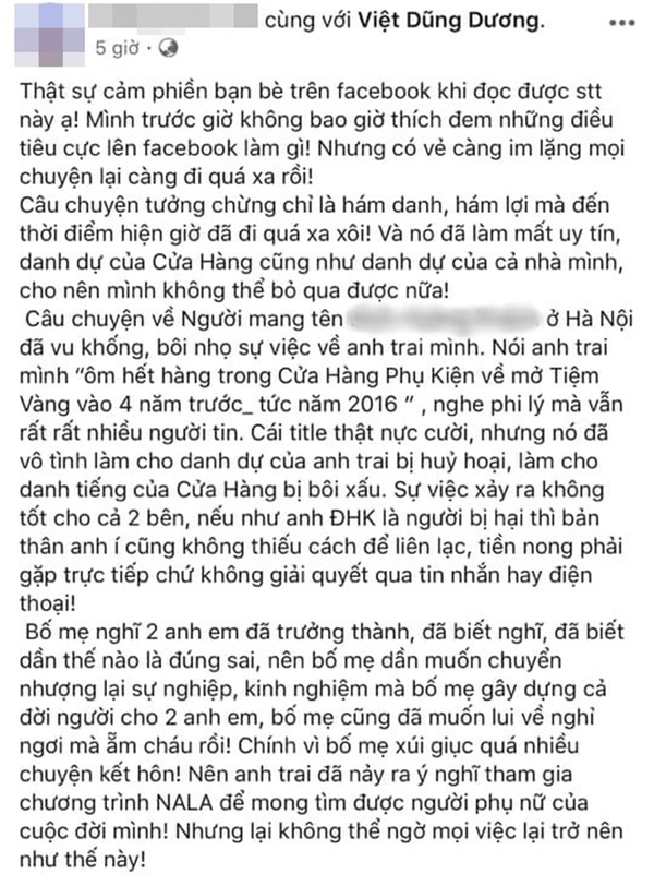 Trong khi đó, anh Đ.H.K vẫn đang tiếp tục đưa ra hàng loạt bằng chứng và hình ảnh chứng minh Việt Dũng ăn cắp đồ đạc tại cửa hàng của mình. Anh cũng khẳng định mình không hề nói điều gì xúc phạm đến bố mẹ và tiệm vàng của gia đình Dũng: “Điều duy nhất tôi nói Dũng là người đã ăn cắp nguyên 1 cửa hàng của tôi vào cuối tháng 11/2015 và chặn mọi thông tin liên lạc của tôi trong suốt thời gian đó. Và tôi không nhắc đến việc làm của gia đình Dũng hay những người thân khác của Dũng.”