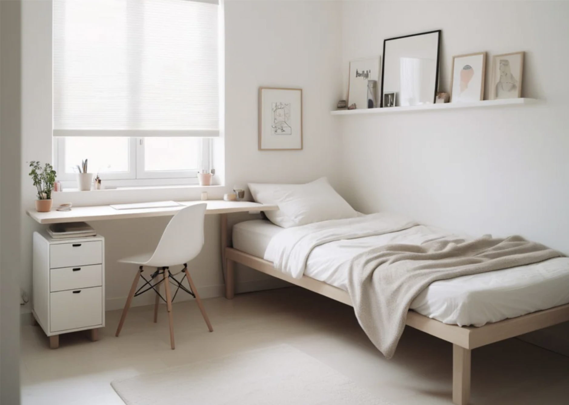 Một căn phòng tối giản thường không có quá nhiều đồ đạc: chỉ một chiếc giường gọn gàng, một bàn làm việc nhỏ, vài món đồ thật sự cần thiết và ánh sáng tự nhiên chan hòa. Mọi thứ đều được sắp xếp ngăn nắp, đủ dùng chứ không dư thừa.