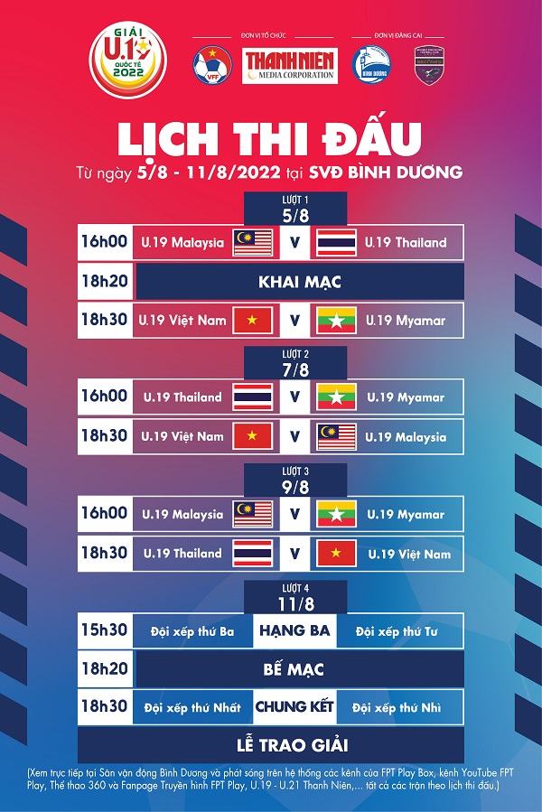 Giải bóng đá U.19 Quốc tế Thanh Niên lần thứ 4 – 2022 sẽ diễn ra từ ngày 5.8 đến 11.8 tại sân vận động Gò Đậu, Bình Dương với sự tham gia của 4 đội: U.19 Thái Lan, U.19 Myanmar, U.19 Malaysia và U.19 Việt Nam. 4 đội sẽ thi đấu vòng tròn một lượt tính điểm xếp hạng, chọn 2 đội xếp nhất – nhì tranh chung kết, 2 đội xếp thứ ba – tư tranh hạng ba.
