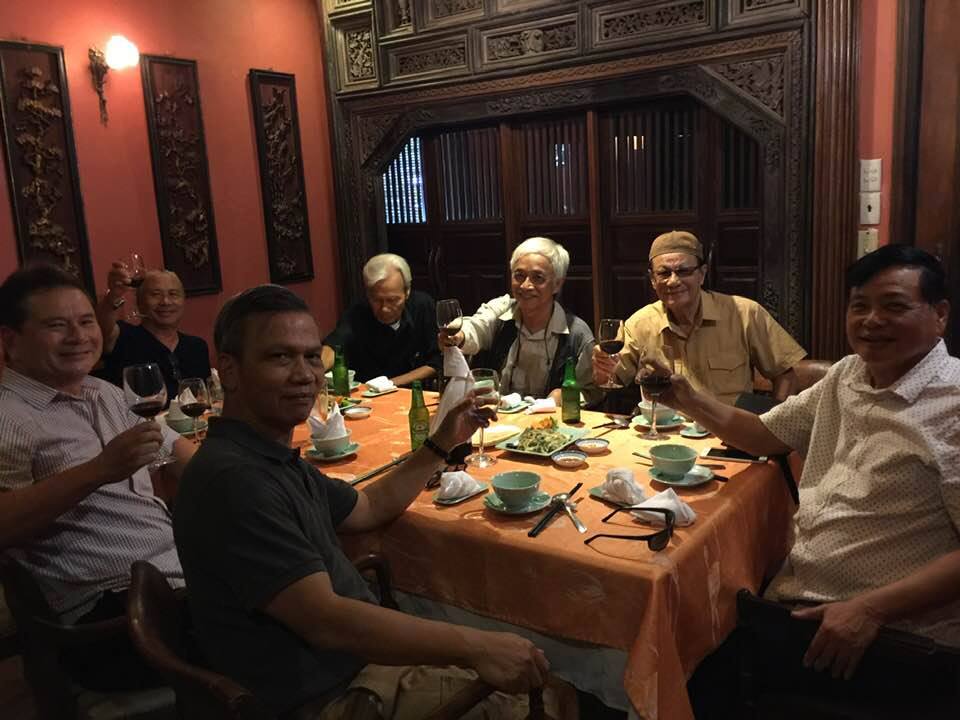 Bạn bè chúc mừng GSTS Nguyễn Hữu Liêm lần ra mắt tác phẩm “Cám dỗ Việt Nam (Nxb Hội Nhà Văn – Hà Nội 2019). Từ phải qua: Nhà báo Nguyễn Công Khế, đạo diễn Lê Cung Bắc, nhà ngôn ngữ học Hoàng Dũng, nhà biên kịch Ngụy Ngữ, nhà báo Nguyễn Khắc Nhượng, Thạc sĩ Trần Sĩ Chương – chuyên gia kinh tế…