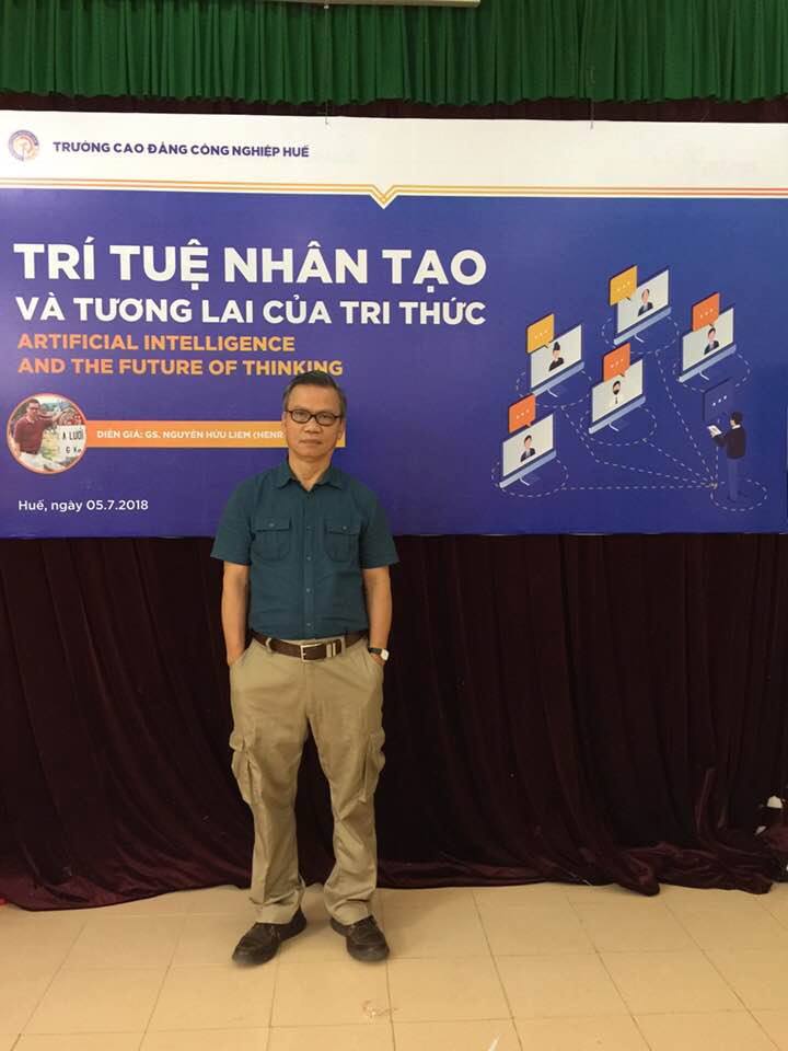 GSTS Nguyễn Hữu Liêm trong một buổi nói chuyện “Tương lai tri thức’ với sinh viên ở Huế