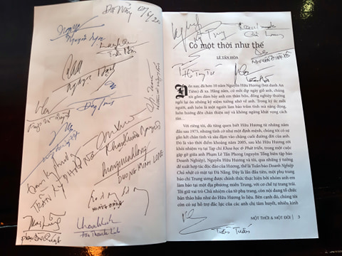 Trang sách với những chữ ký lưu niệm văn nghệ sĩ trên cả nước tựu về nhân ngày phát hành cuốn sách “Nguyễn Hữu Hương, Một thời & một đời”