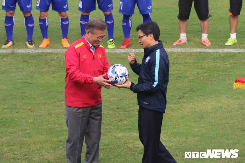 Phó Thủ tướng Vũ Đức Đam cùng U23 Việt Nam đón tiếp Tổng thống Hàn Quốc Moon Jae In tại sân tập VFF.