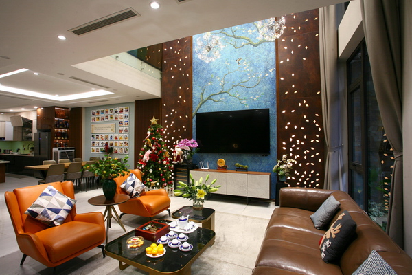Cấu trúc ngôi nhà vừa trải theo chiều sâu và vươn theo chiều cao. Theo đó, tầng 1 là một không gian lớn với phòng khách, phòng ăn, bếp liên thông, cùng phòng ngủ của ông bà. Tầng 2 là phòng ngủ master của bố mẹ, phòng con và không gian giải trí. Tầng 3 là các phòng ngủ con, phòng chơi cho con, phòng media. Tầng 4 là phòng thờ, chỗ giặt phơi, sân thượng – vườn cây. Tất cả các phòng trong nhà đều có thông gió và chiếu sáng tự nhiên. Cửa chính vào nhà được xoay sang bên hông tạo một khoảng sảnh thân thiện, gần cây xanh mà vẫn kín đáo. Cầu thang được đặt ở trung tâm, với thang máy – một thiết bị tiện nghi của những công trình hiện đại. Điều này cũng phù hợp và tiện lợi khi trong nhà có người già. Điểm nhấn ở không gian tầng trệt là khoảng thông tầng cao vút, với bức tranh tường phóng tác từ tác phẩm “Hoa hạnh nhân” của danh họa Vincent van Gogh. Các không gian trong nhà có xu hướng kết nối với nhau và mở ra những khoảng xanh được sắp đặt có chủ đích.