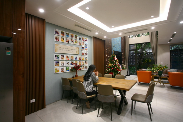 Mỗi không gian có một nét riêng, nhưng vẫn hài hòa trong tổng thể. Kiến trúc sư chia sẻ: Những yếu tố tạo nên hình thức và không gian ngôi nhà không phải là những thứ “làm xiếc”, “làm khó” hay trình diễn; mà là những thứ rất cơ bản, quen thuộc, nhưng được nghiên cứu kỹ và xử lý khoa học để phù hợp ở cả yếu tố công năng, kỹ thuật và thẩm mỹ. Kính là một loại vật liệu được sử dụng nhiều trong công trình, với nhiều mảng lớn ở cửa, vách ngăn, lan can để tạo cảm giác thông suốt, mở rộng tầm nhìn nhưng không lạm dụng, có độ tiết chế. Gỗ cũng vậy, đủ để tạo nên sự gần gũi, ấm áp trong nội thất nhưng không nhiều để gây cảm giác nặng nề, và phần lớn sử dụng gỗ công nghiệp… Màu sắc linh hoạt và hài hòa trong mỗi không gian. Mục đích chung là tạo nên một hình thức hiện đại, trang nhã, sang trọng mà vẫn gần gũi, có tính thời đại nhưng không phải là mốt – có thể lạc hậu theo thời gian.
