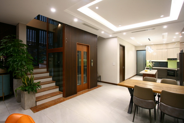 Cầu thang ở trung tâm, với thang máy và thang bộ kết hợp. Buồng thang máy được xử lý hài hòa với không gian nội thất.