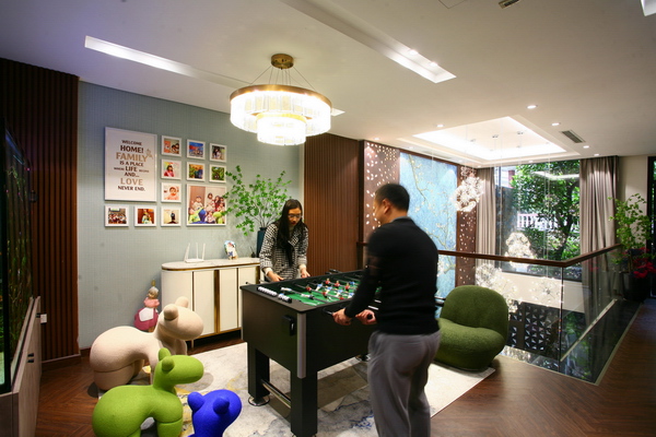 Không gian giải trí trên tầng 2 cạnh khoảng thông tầng.