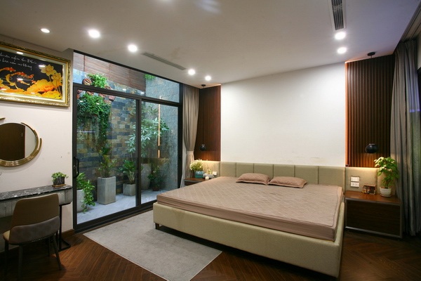 Phòng ngủ master mở ra khoảng xanh sau nhà.