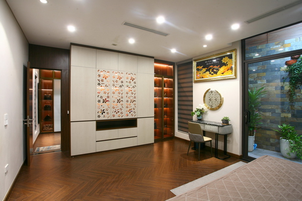 Tủ ngăn giữa phòng ngủ và phòng thay đồ được xử lý tinh tế.
