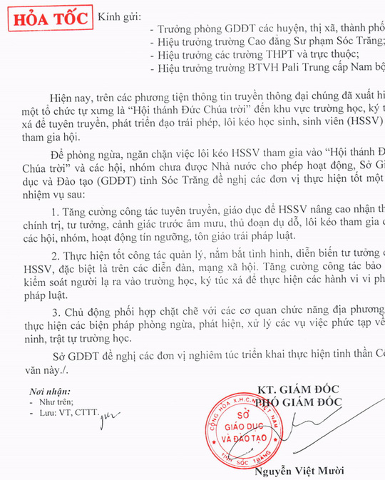 Công văn hỏa tốc của Sở GD-ĐT Sóc Trăng