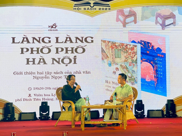 Nhà văn Nguyễn Ngọc Tiến (trái) trong buổi giới thiệu ra mắt hai cuốn sách tại Hội chợ sách Hà Nội lần thứ 8 – 10/2023