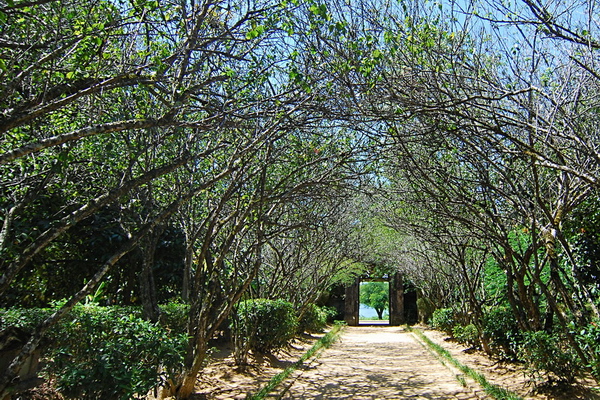 Lối vào nhà đi dưới vòm hai hàng cây mơ.