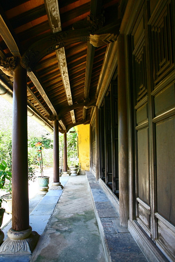 Hiên nhà với những hàng cột gỗ kê trên chân tảng hình vuông.