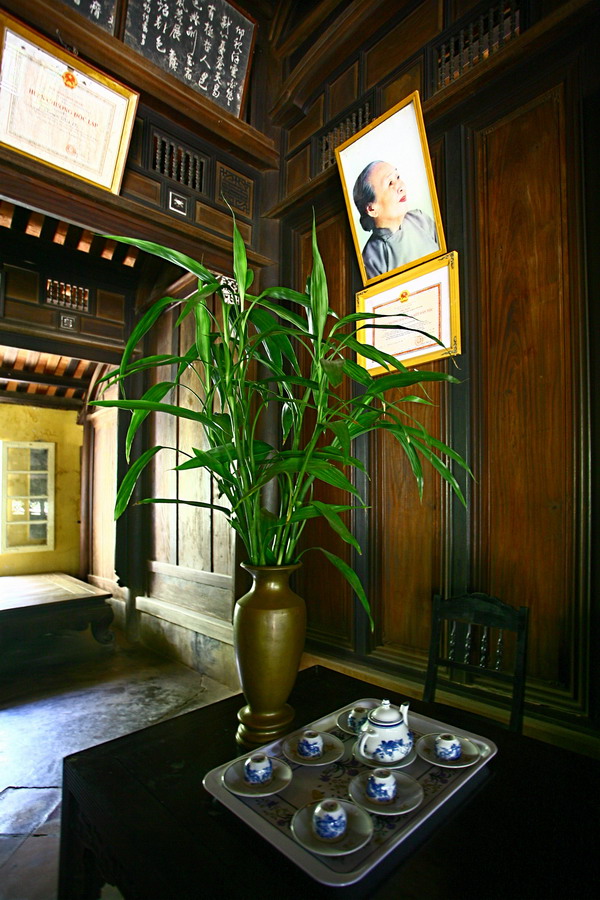 Không gian nội thất của ngôi nhà được phân chia rõ ràng theo chức năng sử dụng. Gian giữa là gian thờ, với nguyên tắc bài trí: “tiền Phật hậu linh” (thờ Phật phía trước, thờ tổ tiên phía sau), hai gian hai bên là nơi tiếp khách theo nguyên tắc “tả nam hữu nữ” (nam bên trái, nữ bên phải), hai chái nhà cũng tương tự, là nơi ở và sinh hoạt của nam (bên trái) và nữ (bên phải), theo quan niệm xưa thời phong kiến. Điều đặc biệt, ngôi nhà có nhiều kỷ vật rất quý của cung đình triều Nguyễn. Đó là bức hoành phi đề 4 chữ “Văn Võ Trung Hiếu” do vua Bảo Đại ban cho gia đình năm 1937, hiện đang treo ở gian giữa, và nhiều bài thơ của Vua Thành Thái, hiện cũng được treo ở nơi tiếp khách trong nhà.