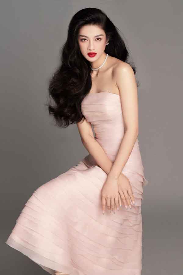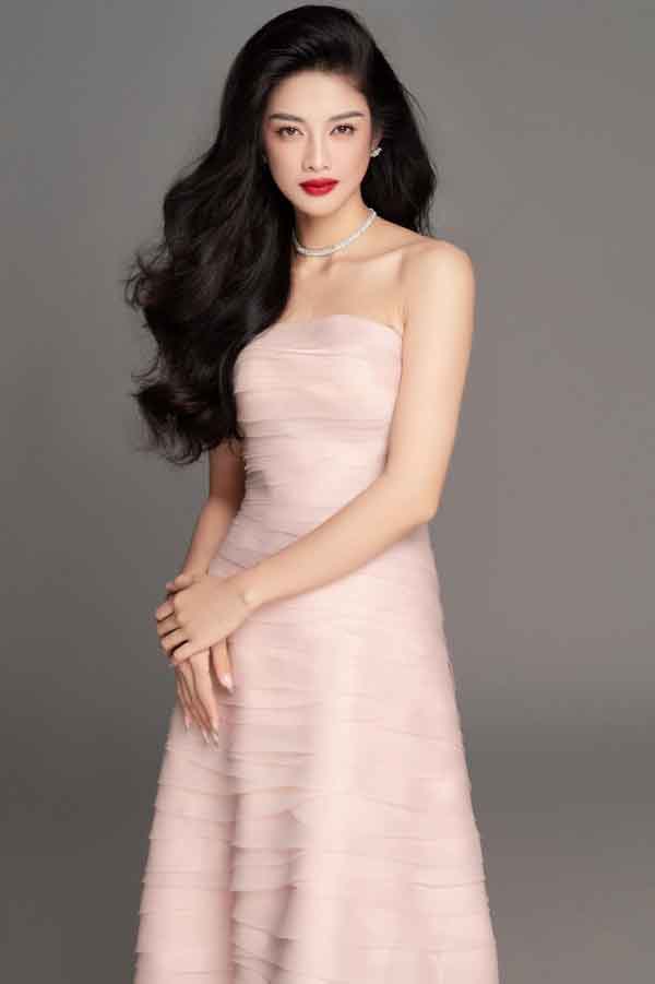 Ở thiết kế thứ hai, Trình Mỹ Duyên hóa thân thành một quý cô thanh lịch trong bộ váy mang sắc hồng kem nhẹ nhàng. Thiết kế cúp ngực giúp người đẹp sinh năm 1995 khoe trọn bờ vai trần gợi cảm.