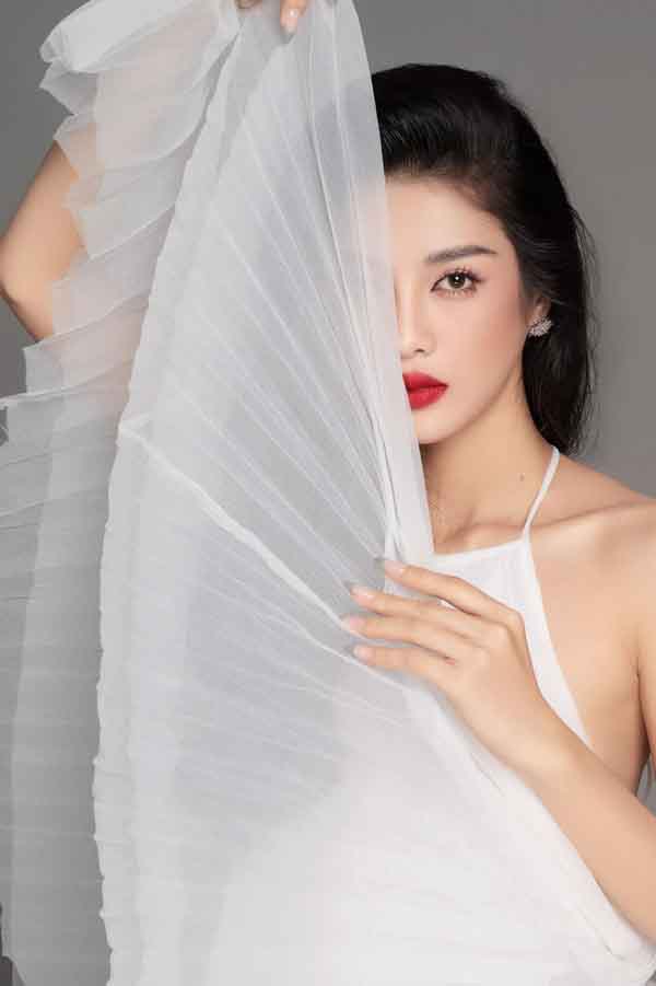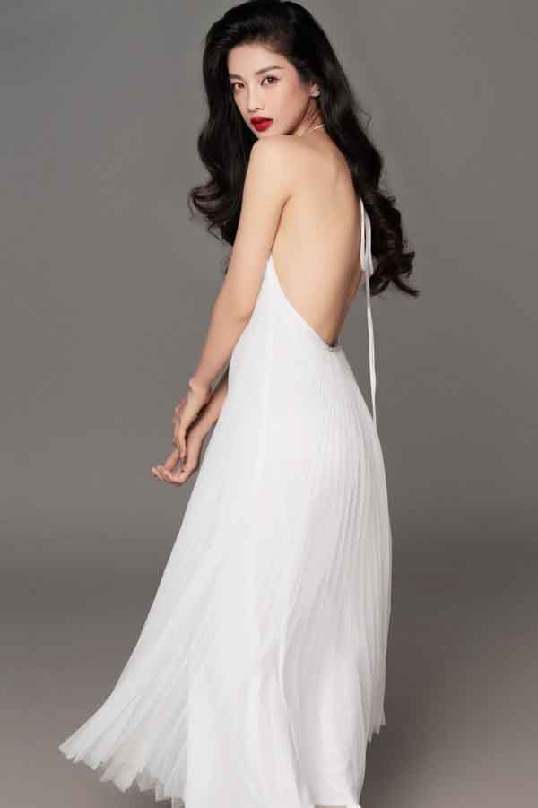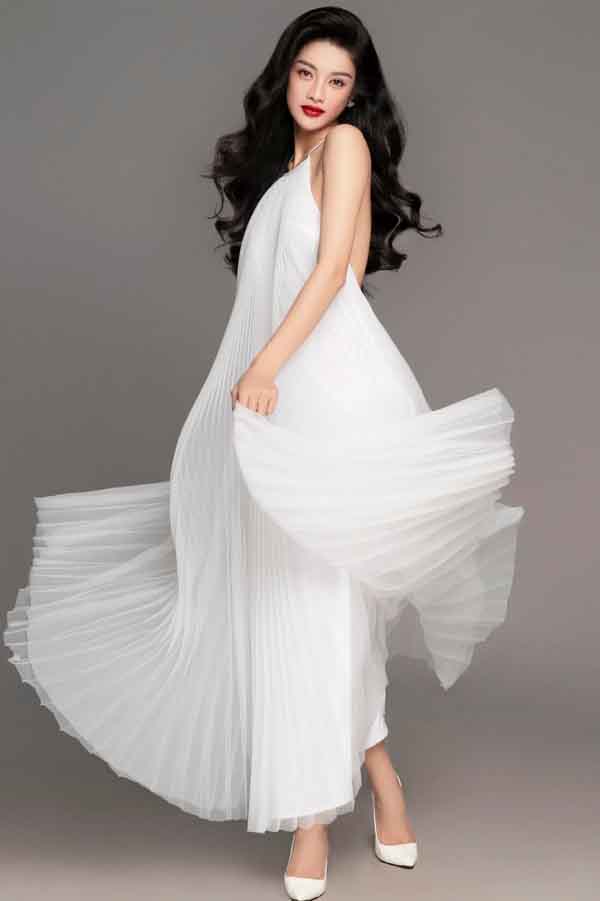 Với outfit đầu tiên, Mỹ Duyên diện chiếc váy với gam trắng đơn giản nhưng không kém phần bay bổng. Thiết kế gấp ly cùng hở lưng giúp nàng ‘Kiều’ tự tin thả dáng, phô diễn vẻ đẹp hình thể.