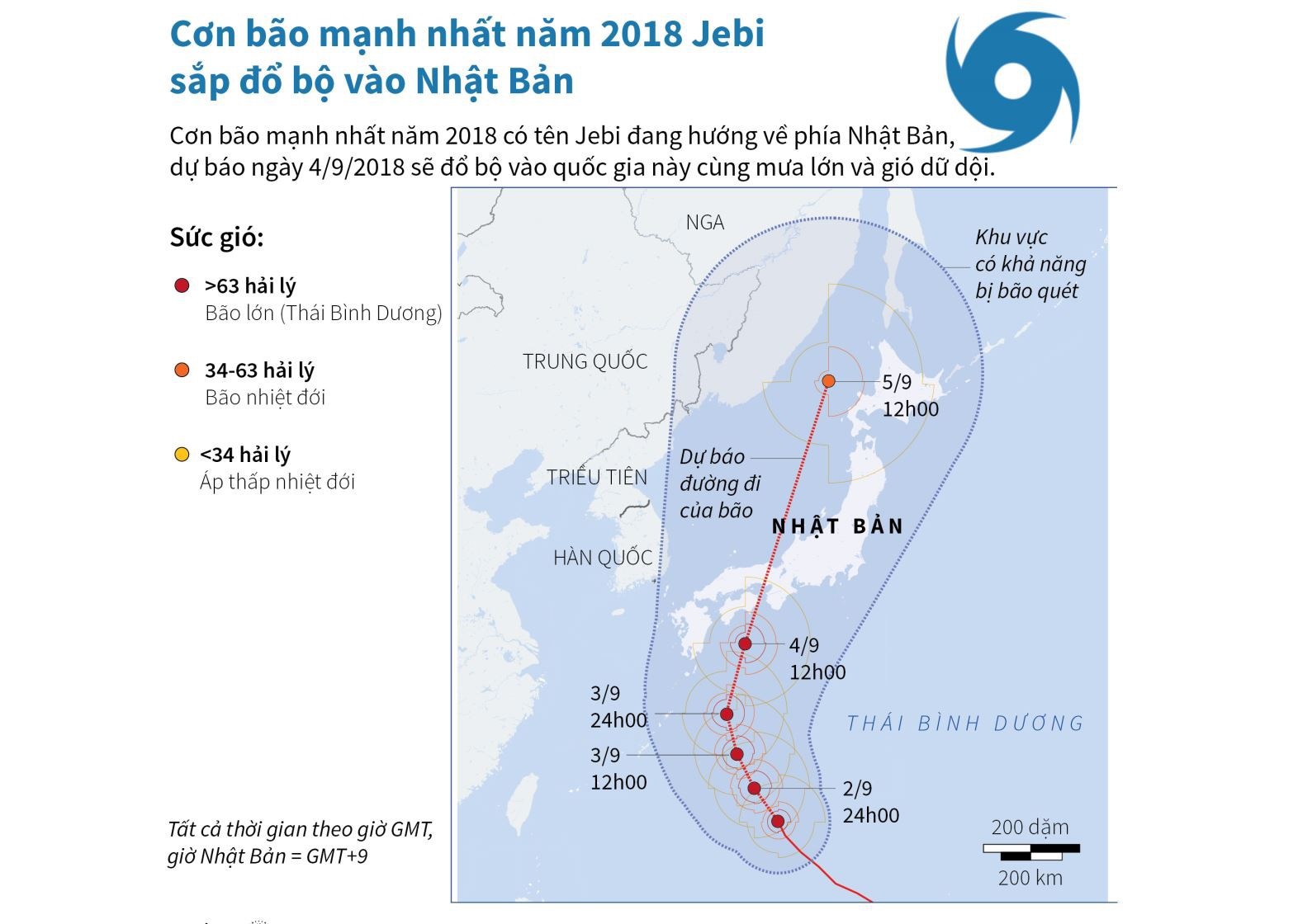 Theo Cơ quan Khí tượng Nhật Bản, nếu vẫn duy trì vận tốc và sức gió này, bão Jebi có thể là cơn bão mạnh nhất đổ vào Nhật Bản kể từ năm 1993. Vùng Shikoku và Kinki có thể phải hứng chịu các trận gió mạnh lên tới 216 km/h, trong khi gió mạnh lên tới 162km/h cũng sẽ ảnh hưởng đến một khu vực rộng lớn trong đó có Tohoku, Tokai, Hokuriku. Bên cạnh đó, một số khu vực ở miền Tây và miền Trung Nhật Bản cũng sẽ có mưa lớn trong sáng 4/9, với lượng mưa có thể lên tới 150 mm.