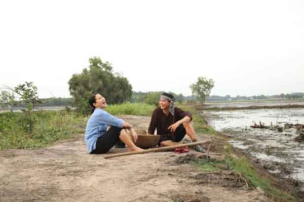 Thân Thúy Hà cười phớ lớ bên Khương Thịnh khi giải lao. Dù quay giữa thời tiết oi bức, nóng nực, khó chịu, các diễn viên vẫn đầy hào hứng, luôn tạo không khí vui vẻ cho cả đoàn.