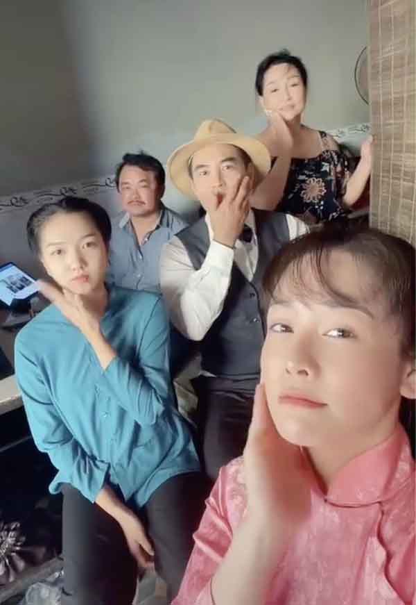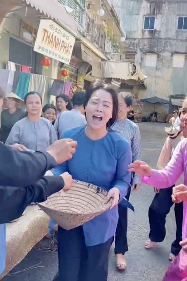 Nhật Kim Anh được xem là “cây hài” của đoàn phim khi thường xuyên bày trò để mua vui, tạo không khí vui vẻ cho mọi người để hiệu suất công việc được cao nhất. Cô thường kéo các diễn viên quay những clip vui để đăng TikTok. Trong ảnh là kịch bản Nhật Kim Anh đóng vai ăn xin, ngả nón để xin vài chục triệu đồng chuẩn bị ăn Tết. Clip cô đăng tải hút cả triệu lượt xem bởi sự dễ thương, độ lầy lội thì khỏi bàn cãi.