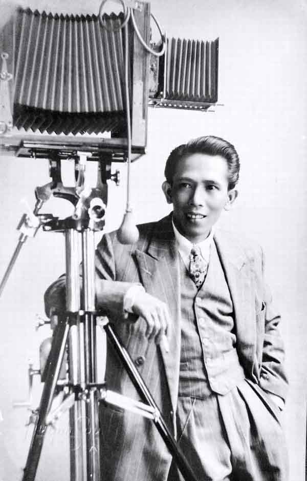 Nhà nhiếp ảnh Huỳnh Sỏ và chiếc máy ảnh của ông (chụp cuối thập niên 1950). Nguồn: tư liệu của Đặng Kế Đông