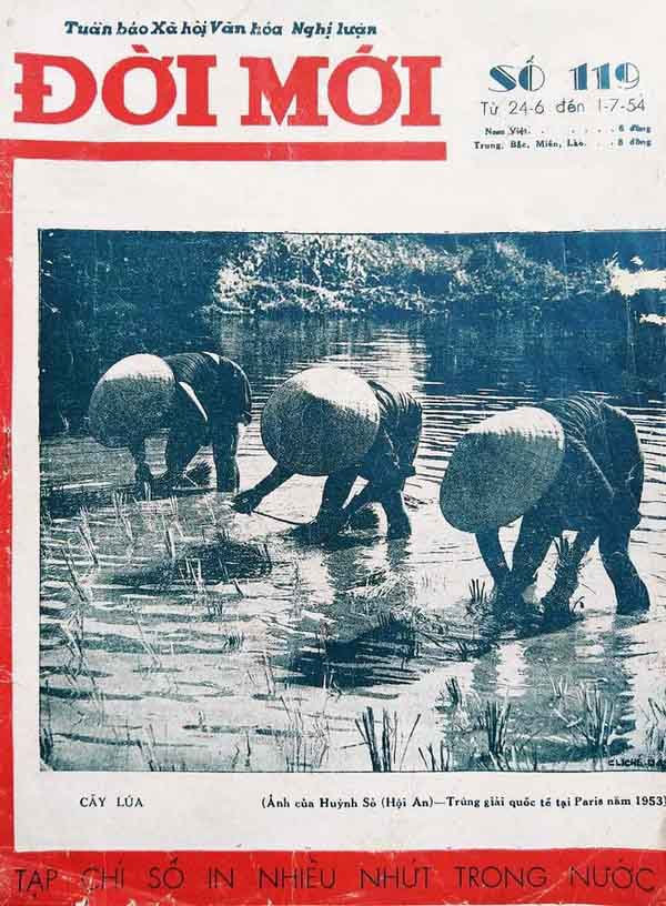 Bìa tuần báo Đời mới xuất bản ngày 24.6.1954 đăng tác phẩm Cấy lúa của nhà nhiếp ảnh Huỳnh Sỏ đoạt giải cuộc thi ảnh quốc tế tại Paris 1953. Nguồn: tư liệu của Đặng Kế Đông