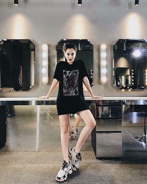 Đây là một chiếc áo phông có họa tiết đặc biệt và đậm chất streetwear. Mốt giấu quần kết hợp áo thun oversized với đôi sneaker của Balenciaga.