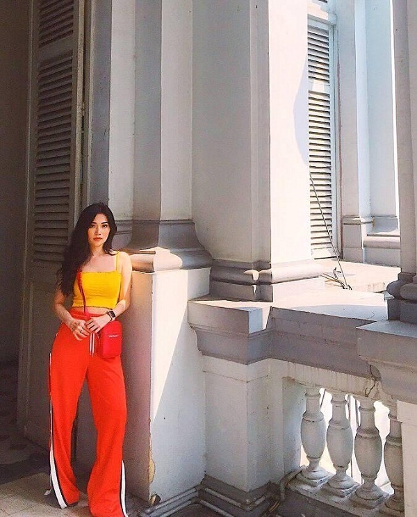 Đây là kiểu mix crop top màu vàng với quần kẻ sọc màu đỏ, nhìn bạn sẽ rất trẻ trung.