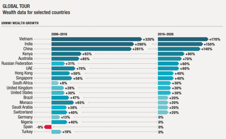 Theo báo cáo The Wealth Report (do đơn vị tư vấn bất động sản Knight Frank thuộc Vương quốc Anh công bố), nhóm người siêu giàu có tài sản ròng cực cao (UHNWI) ở Việt Nam đã tăng trưởng đến 320% – tỷ lệ cao nhất thế giới từ năm 2006 đến 2016, gấp hơn 10 lần so với Mỹ (30%).