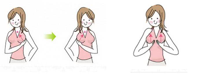 Nâng bầu ngực trái của bạn bằng tay phải (có thể dùng tay trái hỗ trợ phía dưới). Nhẹ nhàng đẩy khuôn ngực theo chiều hướng lên xương quai xanh dưới cổ. Thực hiện động tác đẩy lên xuống khoảng 2-3 lần mỗi giây. Lặp lại thêm 25-30 lần và thực hiện tương tự với bên kia.