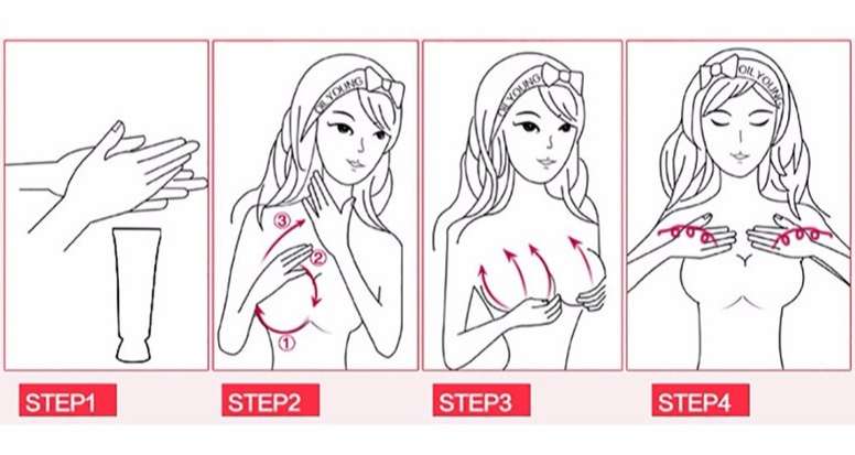 Làm ấm hai lòng bàn tay bằng cách xoa vào nhau. Dùng cả hai tay cho cùng một bên ngực, đẩy bầu ngực lên trên. Tiếp tục thực hiện động tác thêm 15-20 lần rồi đổi bên. Chú ý đẩy ngực hướng lên vùng vai và cổ, có thể di chuyển ngực theo chuyển động hình xoắn ốc. Bàn tay tác động nhẹ nhàng, tránh miết quá mạnh khiến ngực bị tổn hại.