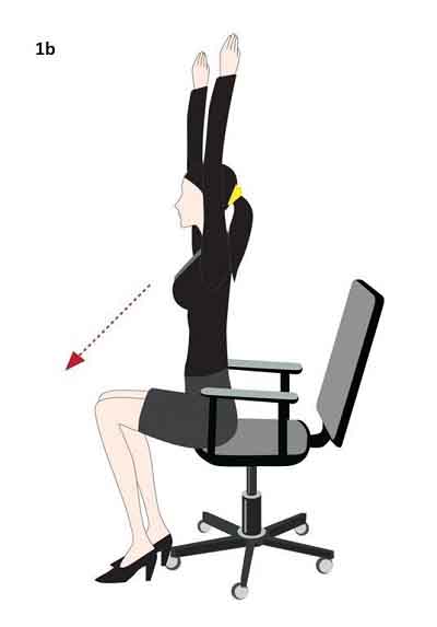 Chỉ cần 1 chiếc ghế, bạn đã có thể tập được. Tranh thủ thời gian nghỉ ngơi ở công sở thực hành ngay bài tập cho lưng và bụng này nhé! Giữ lưng thẳng, ngồi sát vào ghế, đưa tay lên cao rồi từ từ gập người về phía trước, tay hạ theo ôm hai chân, kéo căng lưng và ngửa cằm lên sao cho bụng chạm đùi. Trở về tư thế ban đầu và lặp lại ít nhất 5 lần (Hình: 1a, 1b, 1c).