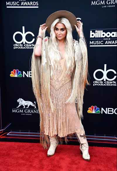 Kesha xuất hiện cùng trang phục rườm rà, khó hiểu không kém, kết hợp áo choàng tua rua và váy đính hạt lấp lánh.