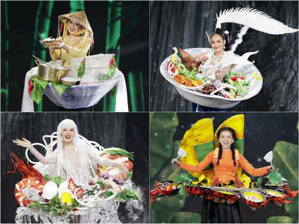 Nhiều món ăn gắn với ẩm thực người Việt như phở, bánh xèo, bún nước lèo… đều được tái hiện sống động trên sân khấu.